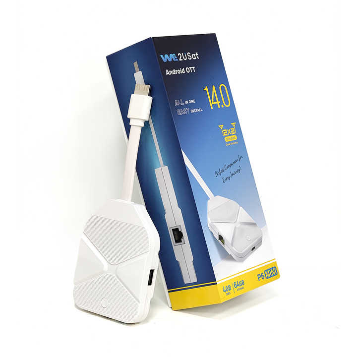 We2USat P6 Mini Android TV Stick 4GB/64GB con Amlogic S905Y4 Android 14.0 BT 5.0 Wifi 6 6K Streaming TVStick SuperBox TV Box