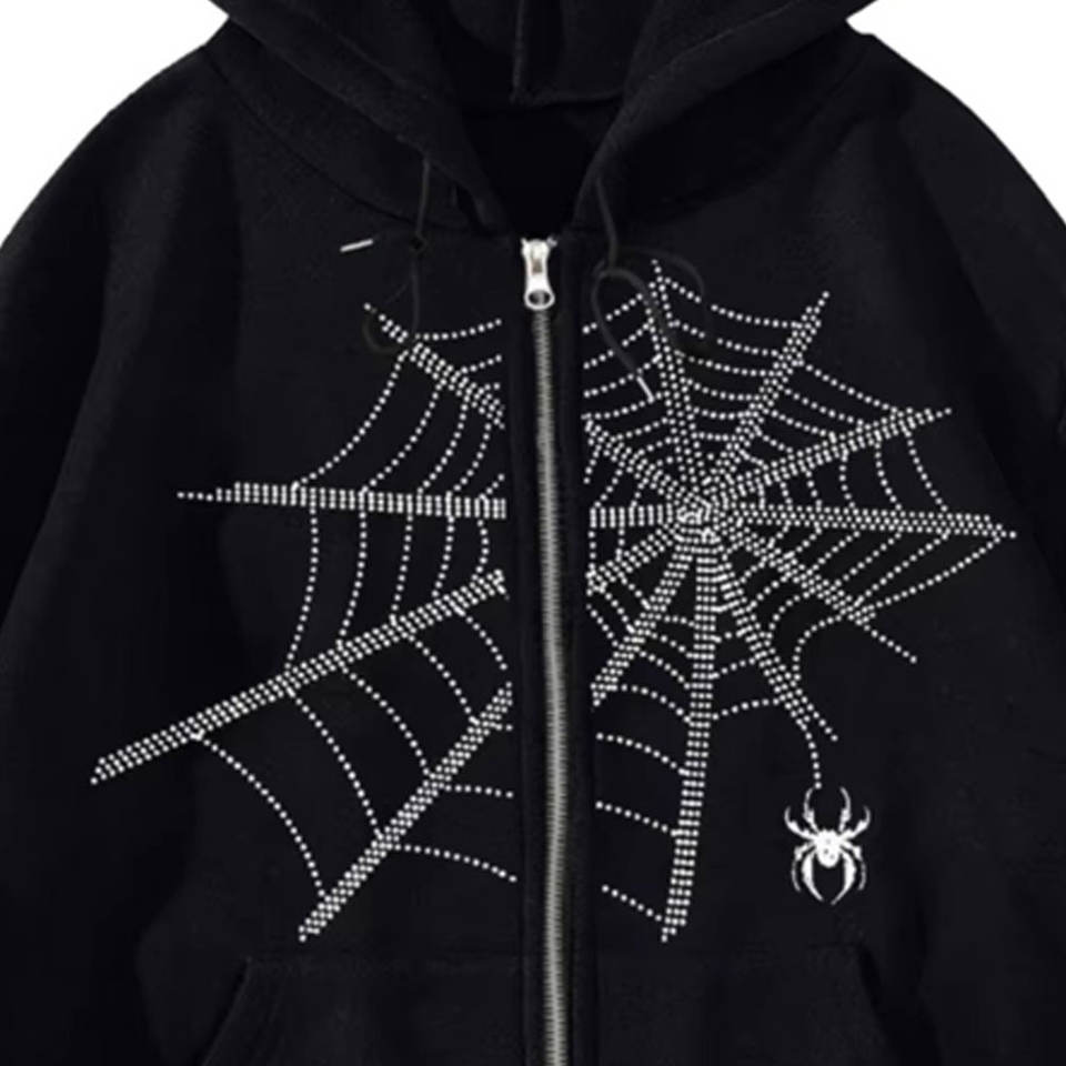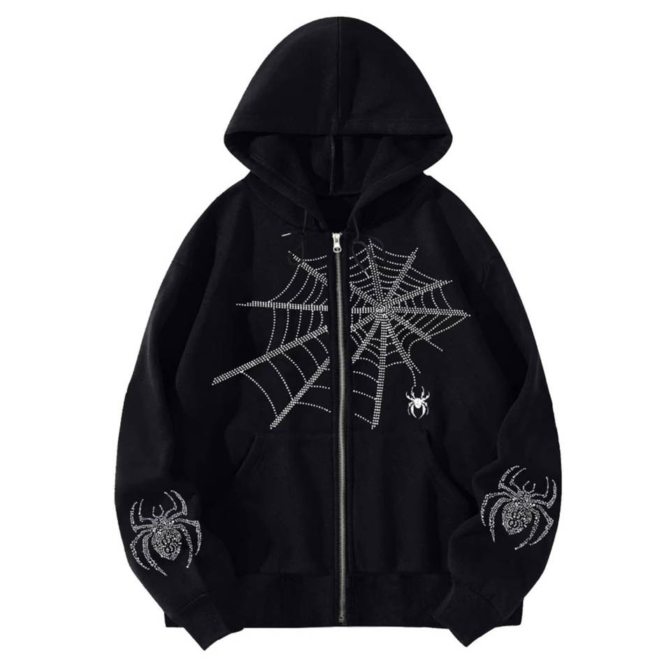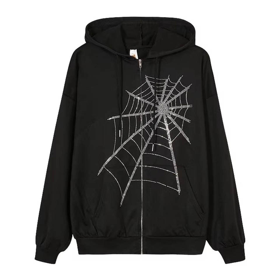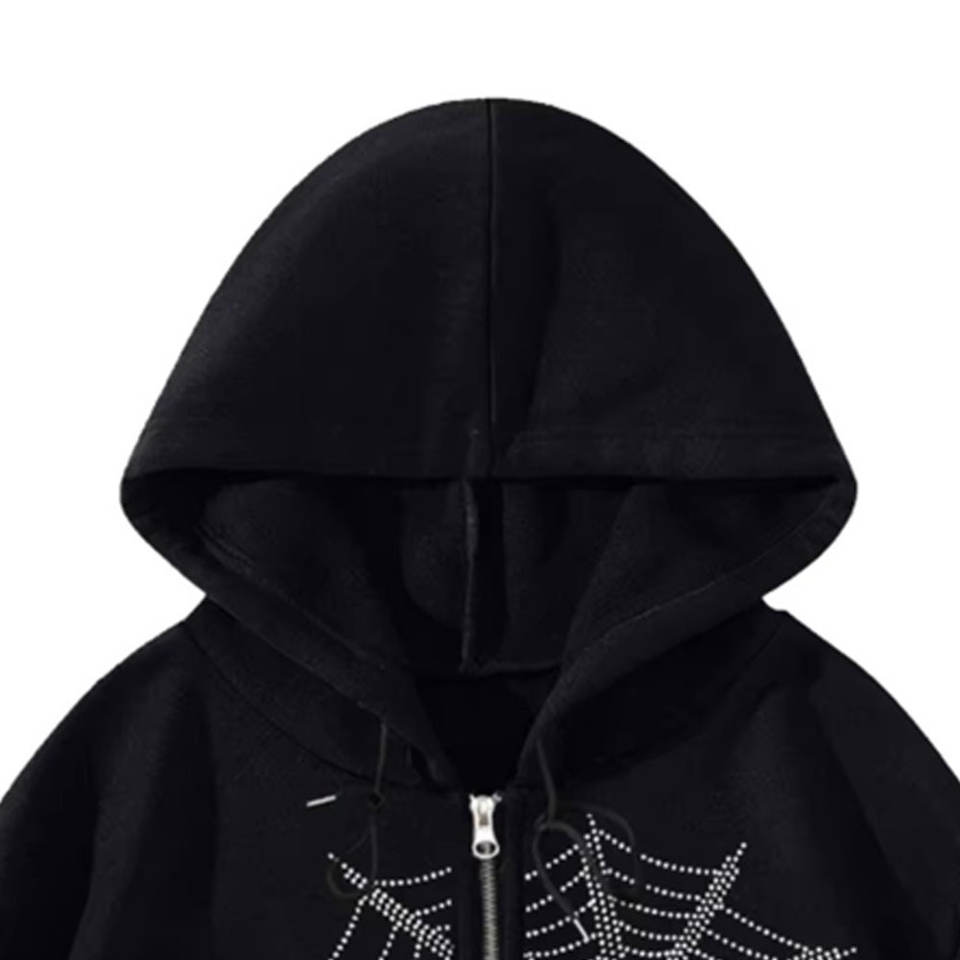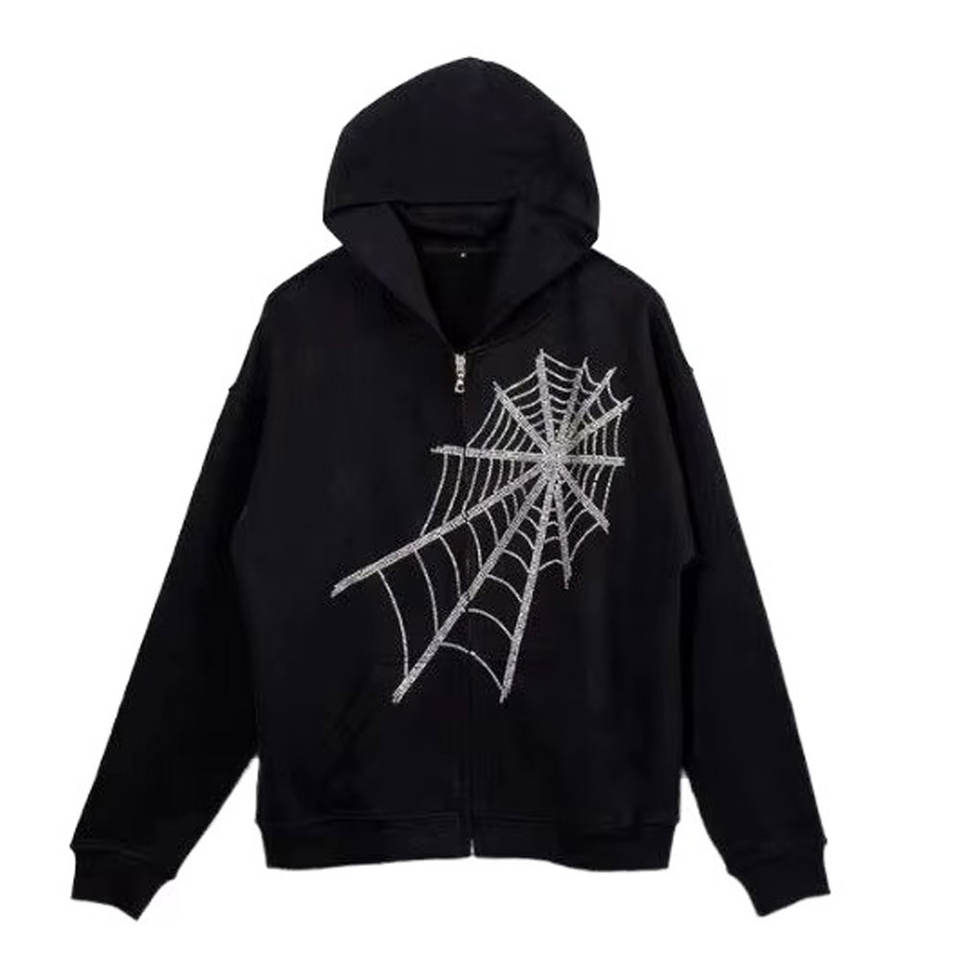 Sudadera con Capucha Wearpex con Diseño de Telaraña y Pedrería, 100% Algodón Felpa, Cierre de Cremallera, Negra, Talla Grande, Unisex, Estilo Urbano, Lujosa, Hiphop