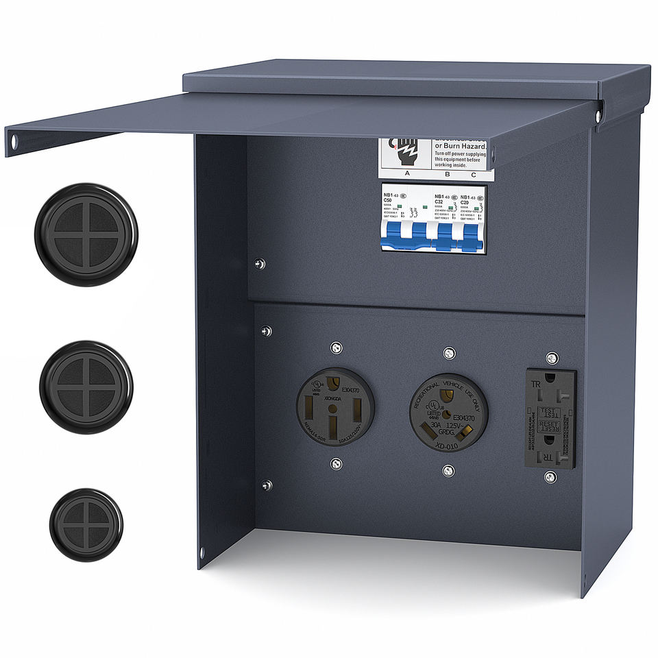 Receptáculo de RV para exteriores resistente a la intemperie con interruptor de 20 30 y 50 amperios, caja de Panel de toma de corriente de RV temporal no medida precableada para gris