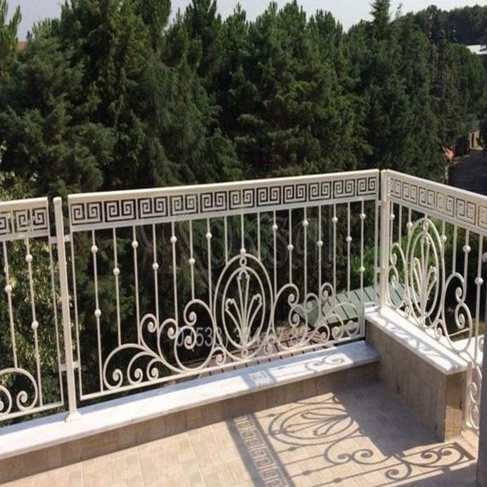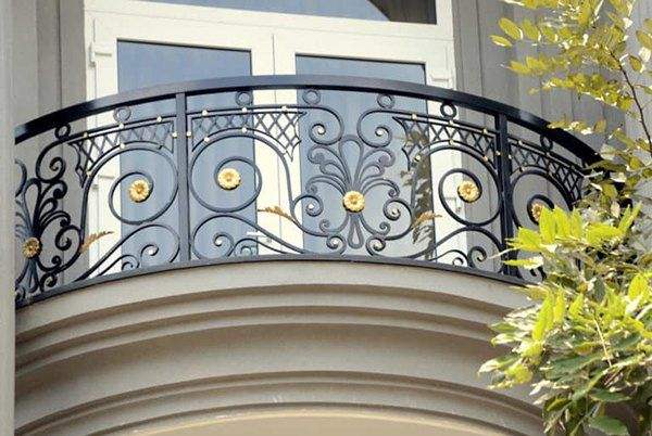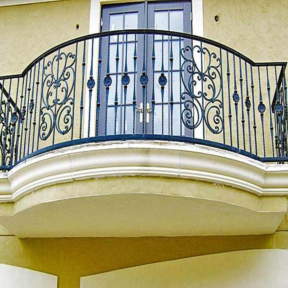 Barandilla de balcón de metal resistente a la intemperie con volutas decorativas, ideal para fachadas de edificios clásicos y contemporáneos