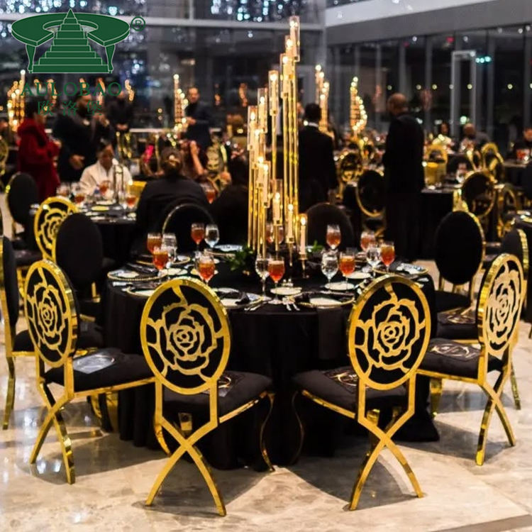 Silla de comedor de terciopelo negro con diseño de rosa dorada para bodas y eventos