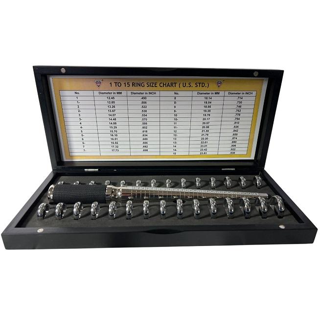 Juego de Medidores de Anillos de Boda, Estándar Estadounidense 1-15, con Empuñadura de Goma, Mandril de Aluminio y Calibrador de Tallas de Anillos en Caja de Madera