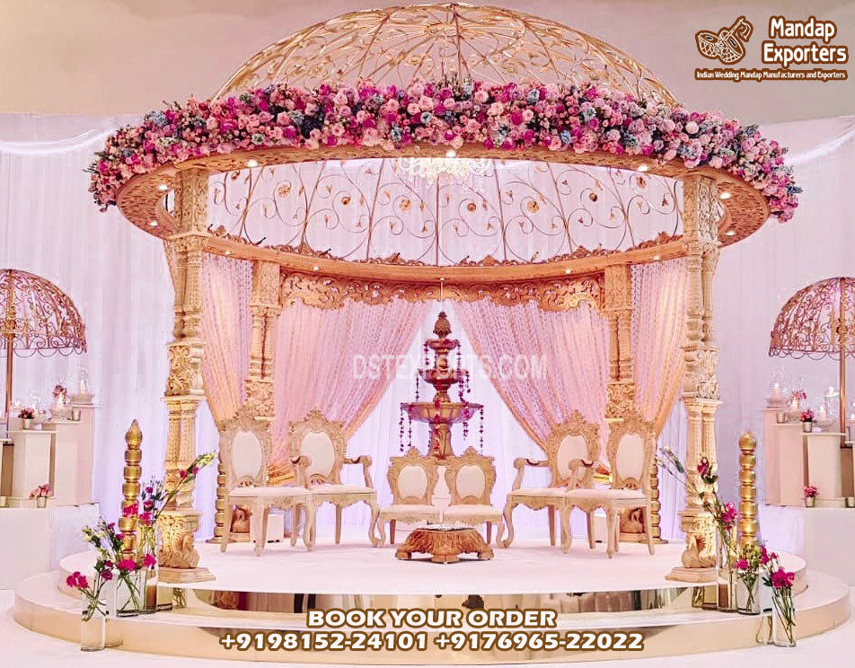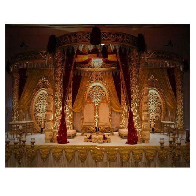 Conjunto de Mandap dorado para boda, conjunto de Mandap de fibra completa para boda, Mandap de fibra tallada dorada con paneles, venta de escenario personalizado en Reino Unido