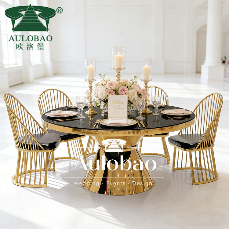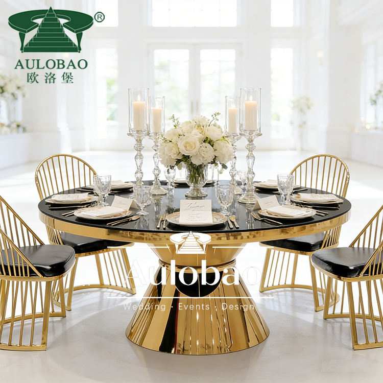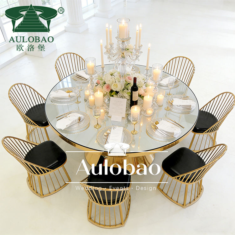 Mesa de Comedor de Cristal para Bodas y Eventos, con Base de Acero Inoxidable Dorada