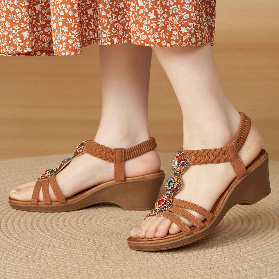 Sandalias de Plataforma Marrones Cómodas para Verano, Primavera y Otoño, Sandalias de Moda con Pedrería Decorativa y Correa en T