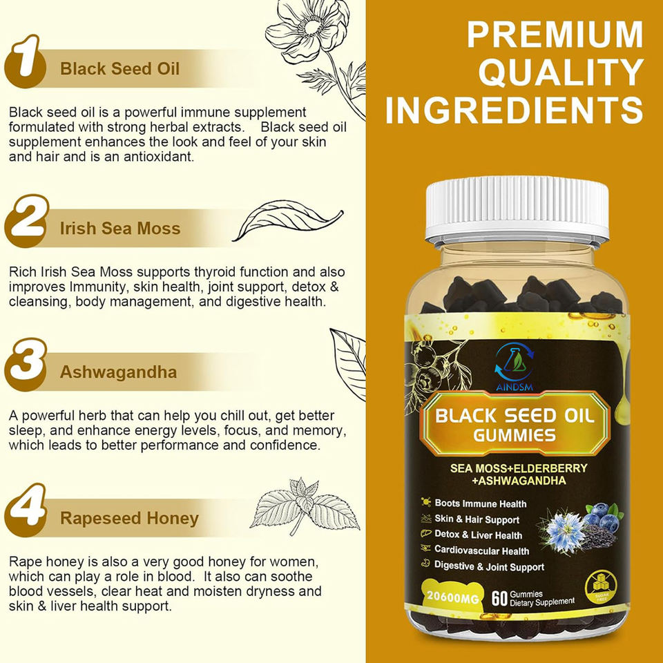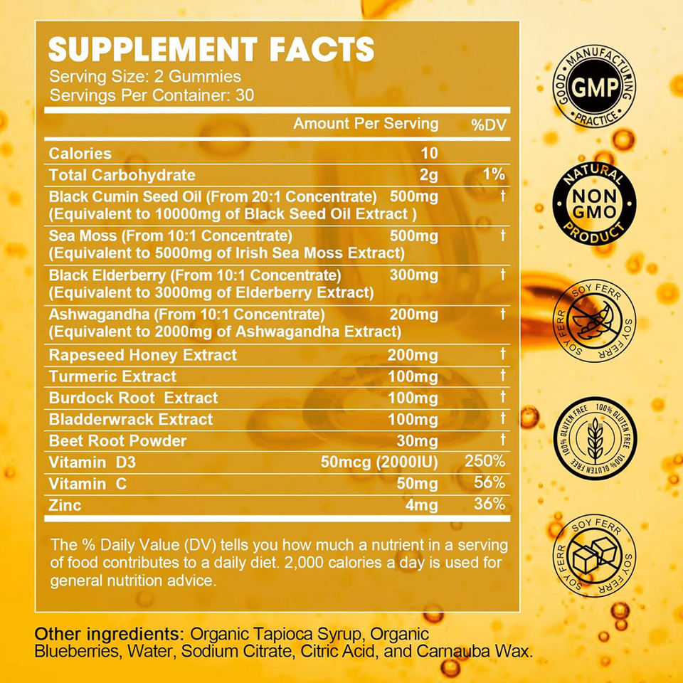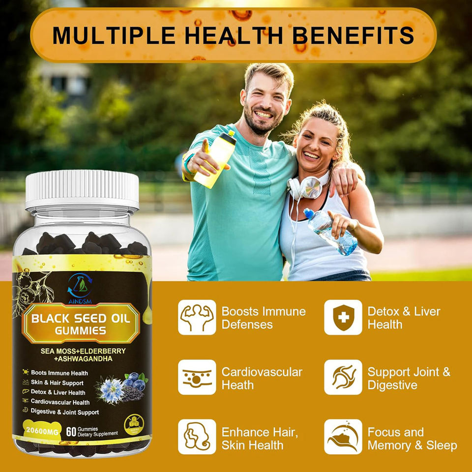 Gomitas de Aceite de Semilla Negra, Baya del Saúco y Musgo Marino Bien Diseñadas, Orgánicas, Desintoxicantes y para la Salud del Hígado, con Vitaminas y Ashwagandha