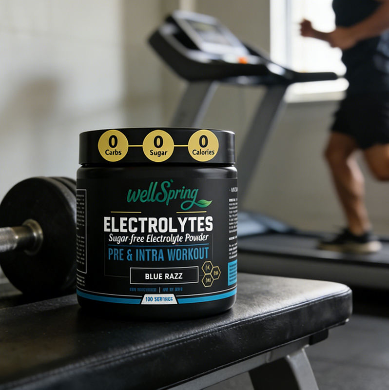 WellSpring - Polvo Electrolítico Sin Azúcar, Sabor Frambuesa Azul, con Potasio, Magnesio, Calcio y Minerales Traza, 100 Porciones, Pre e Intra Entrenamiento
