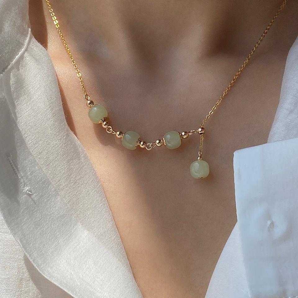 Collar Ajustable de Jade Natural de Hotan Envuelto en Oro de 14K Hecho a Mano por Wenchi, Delicado, Cálido, Lujoso y con Patrón Exclusivo
