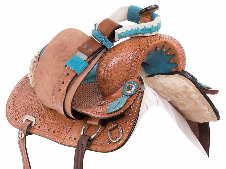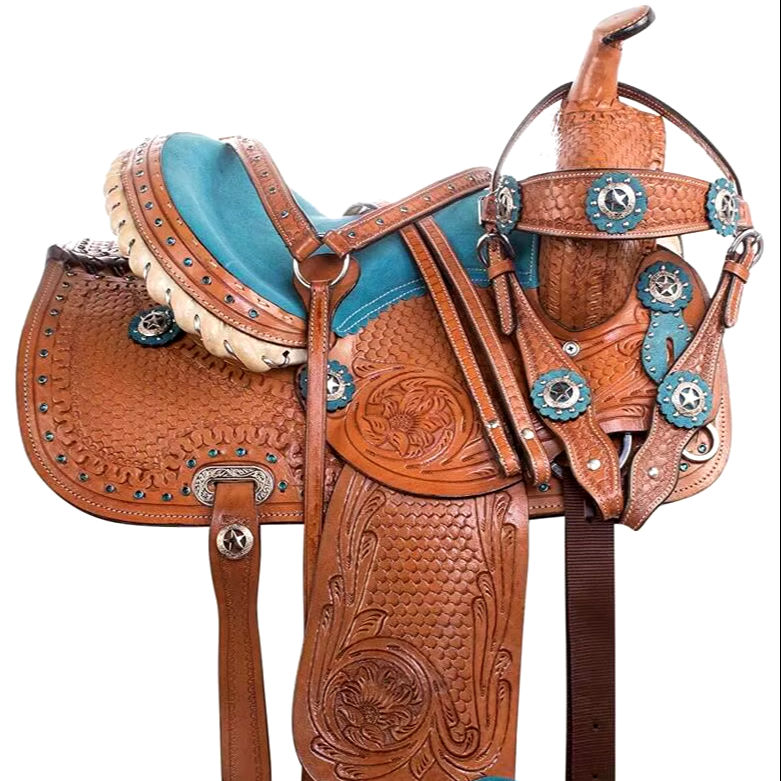 Western Barrel Racing Pleasure Trail Asiento profundo Asiento de caballo de cuero Premium con caballete a juego, coraza, riendas.