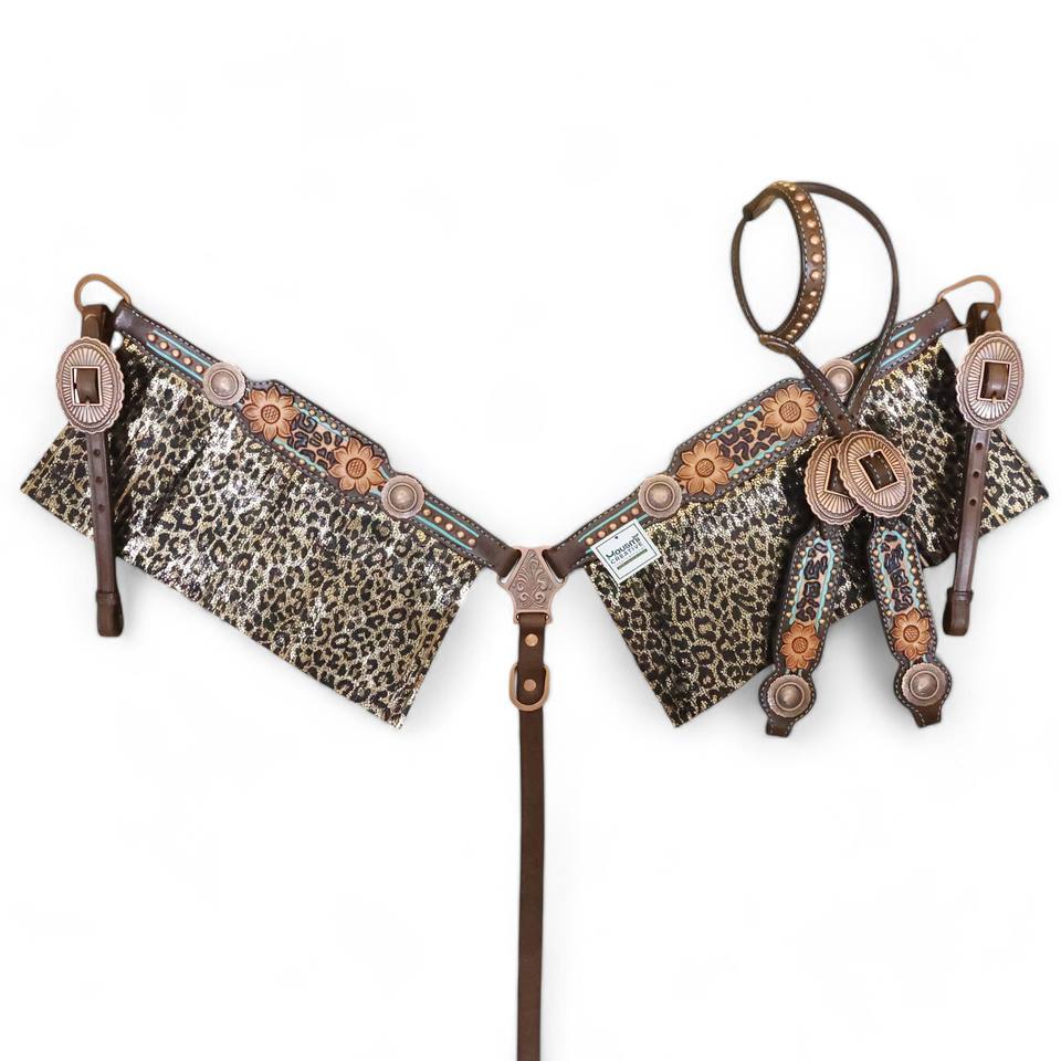 Caballo occidental Leopard Tooled cuero Headstall & Fringe BreastplateNombre del producto