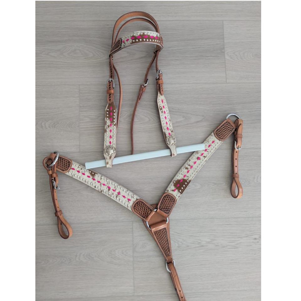 Conjunto de cabezada y correa de pecho de equitación western de perfil alto, de cuero genuino, con cierre de hebilla ajustable, herrajes en tono plateado y flecos