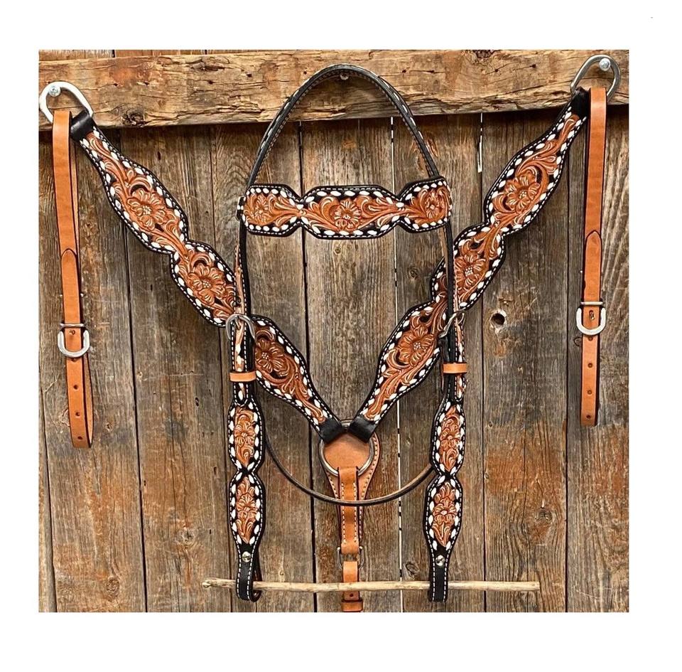 Conjunto de cuello de cabeza y pecho occidental Cuero de vaca de primera calidad Tendencia superior ligera Diseños de cuentas personalizados Tachuela de caballo de temporada