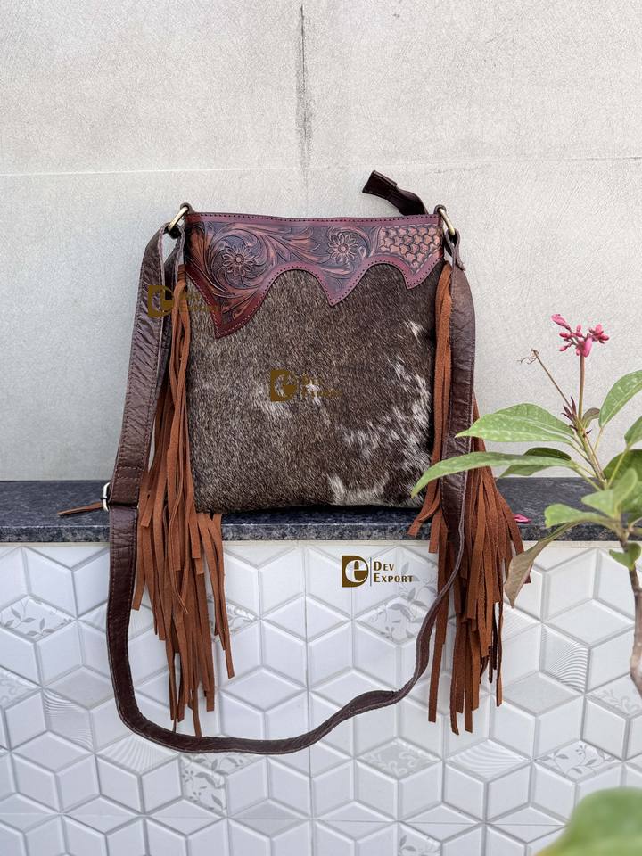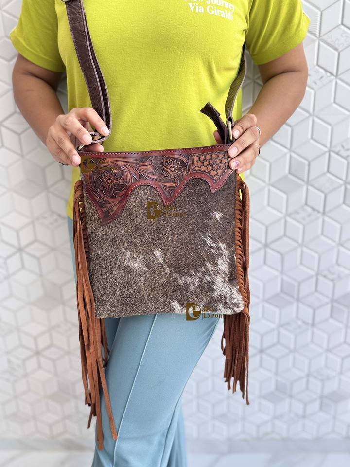Western Pattern Hand Tooled Carving Handbag Designer Cowhide Fur Leather Gypsy Boho Vintage Fringe Shoulder Bag Stylish Bags