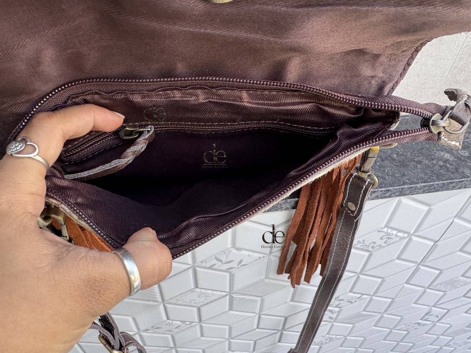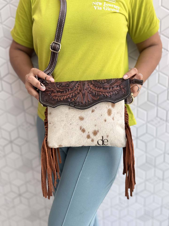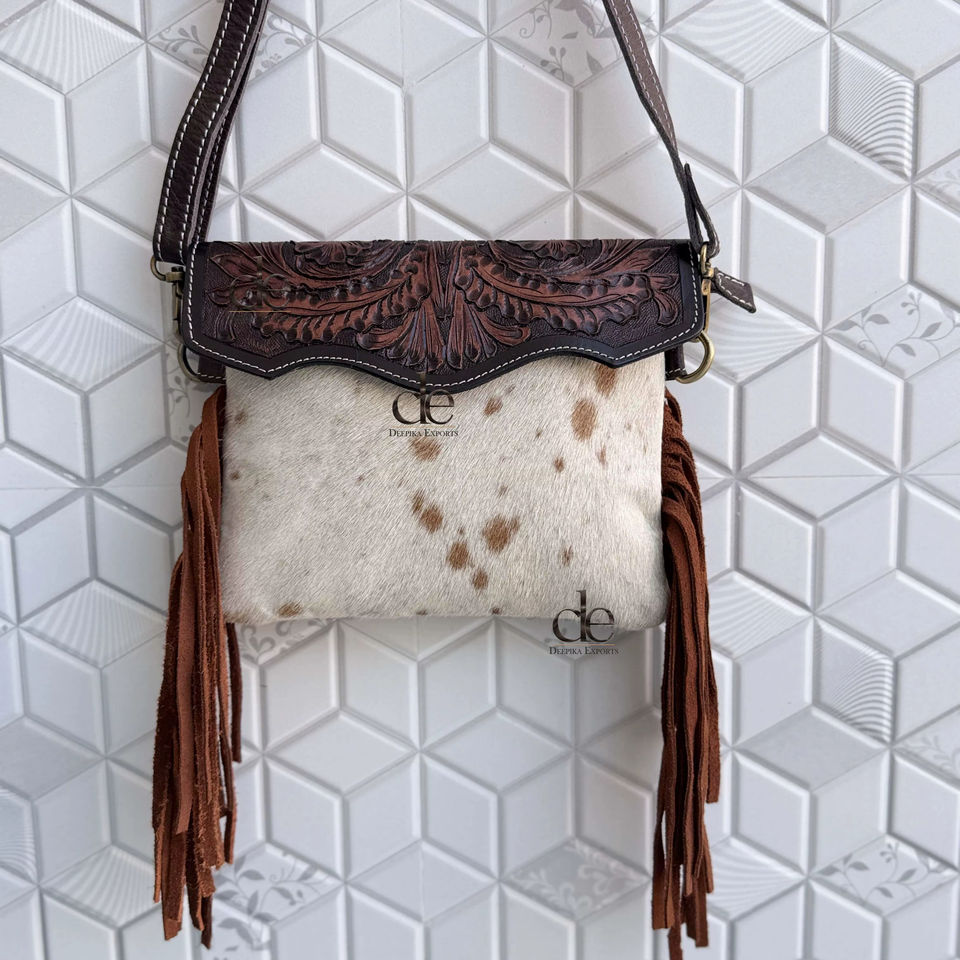 Bolso bandolera de cuero con flecos y grabado a mano estilo occidental, vintage, bohemio, hecho a mano, de piel con pelo, multiusos.
