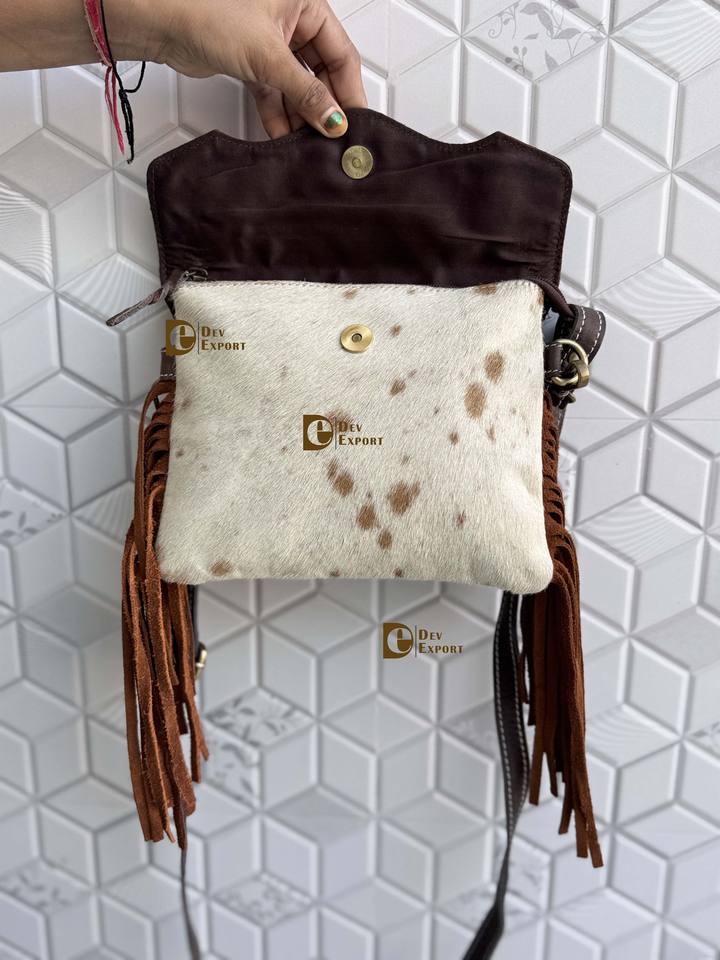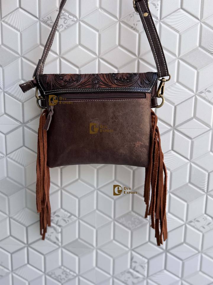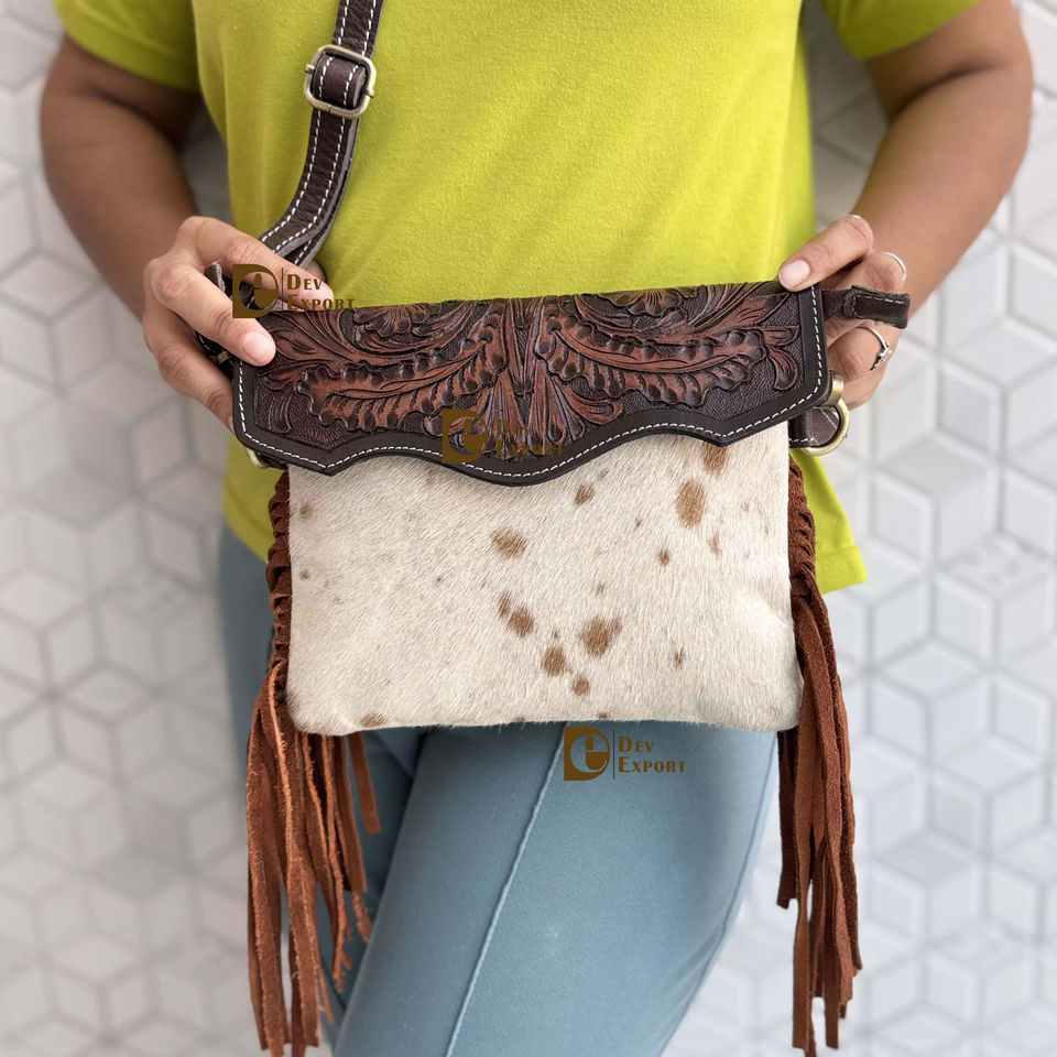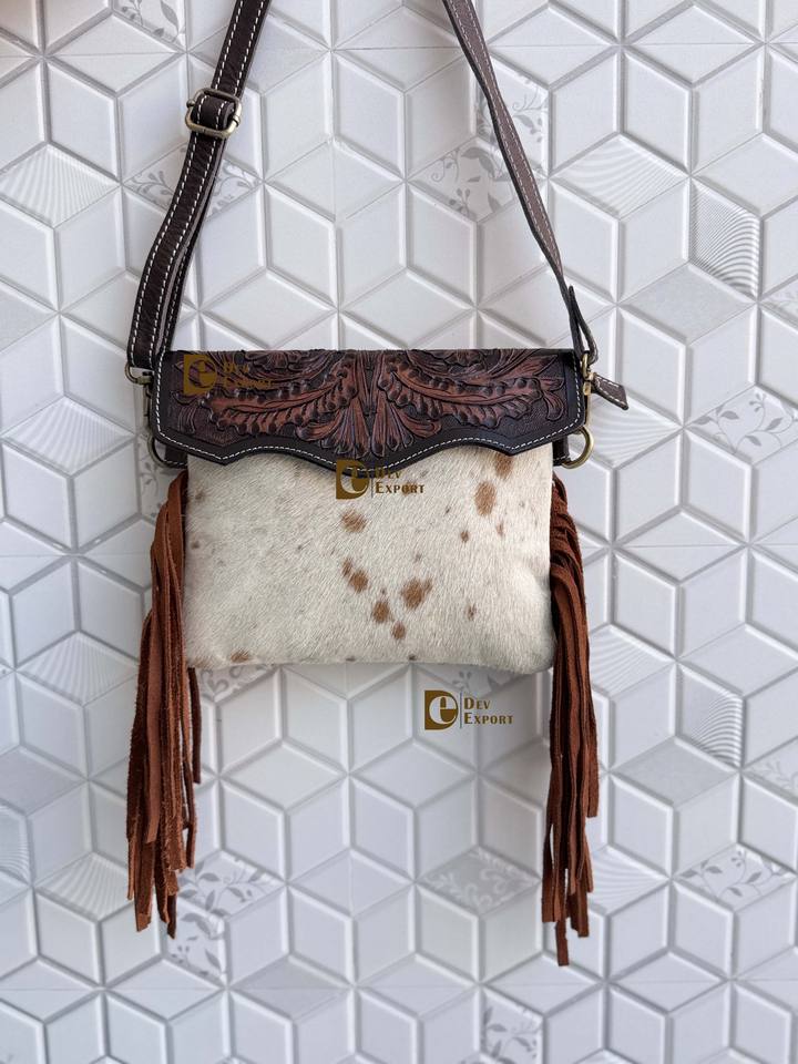 Bolso bandolera de cuero con flecos y grabado a mano estilo occidental, vintage, bohemio, hecho a mano, de piel con pelo, multiusos.