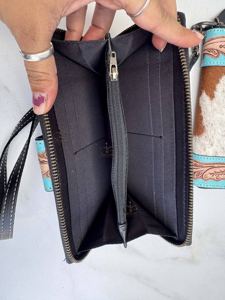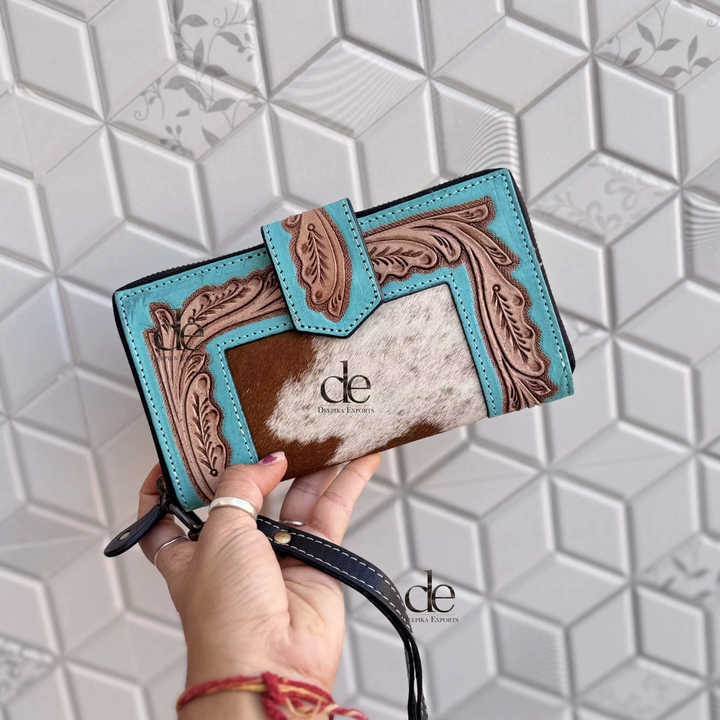 Cartera de Cuero con Diseño Western, Tallada a Mano, con Borde de Color Turquesa, Cartera de Cuero Vacuno Multiusos