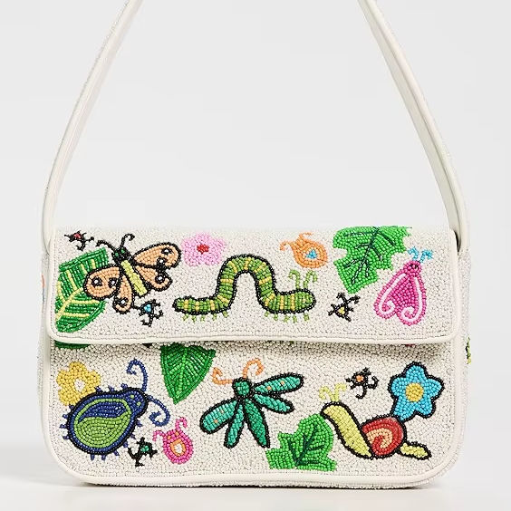Bolso de Hombro Bordado con Cuentas Blancas, Bonito Diseño de Insectos de Jardín, Oruga, Mariposa, Caracol, Bolso de Mano para Mujer, Bolso de Verano con Solapa