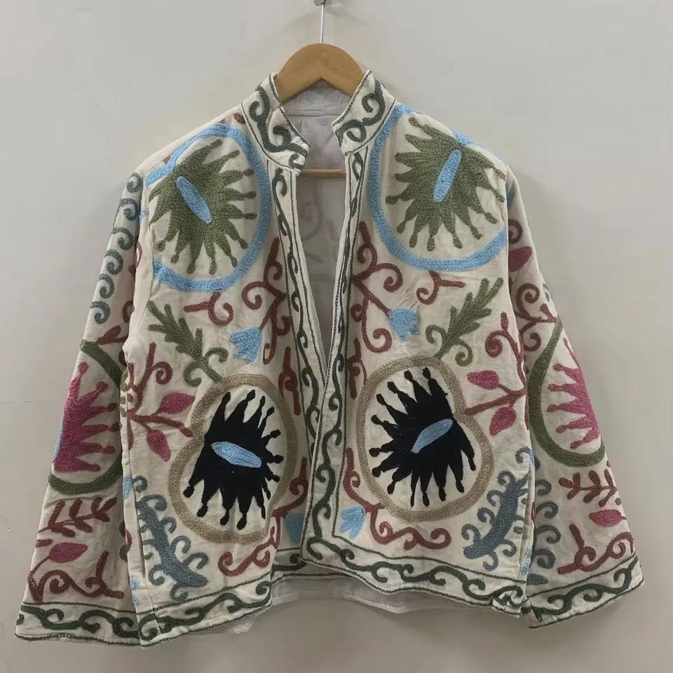 Chaqueta Bordada Floral Bohemia Blanca, Abrigo Suzani 100% Algodón con Estampado Floral Invernal