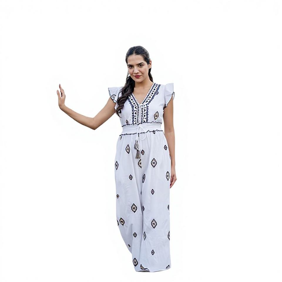 Mono Midi Blanco Bohemio Bordado con Cuello en V y Manga Abullonada, Estampado Digital, para Verano, Estilo Resort, 100% Algodón