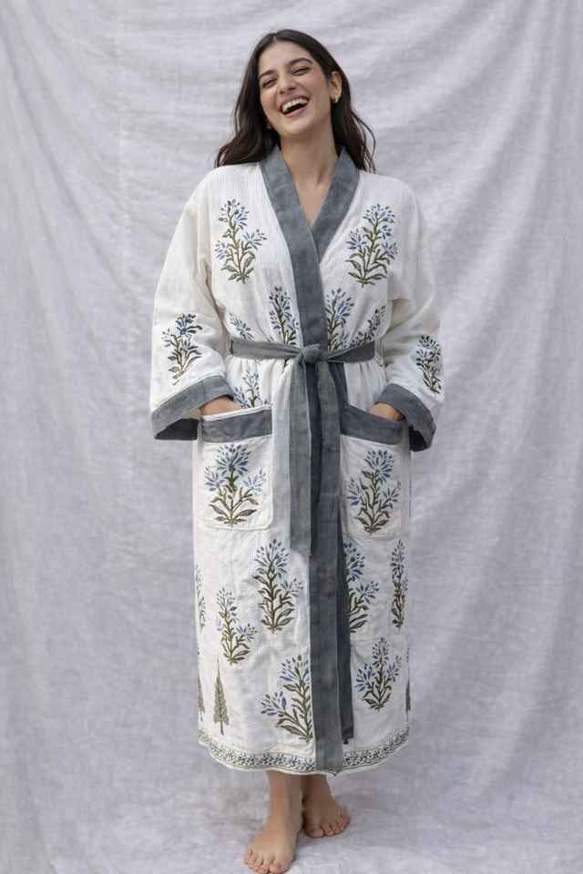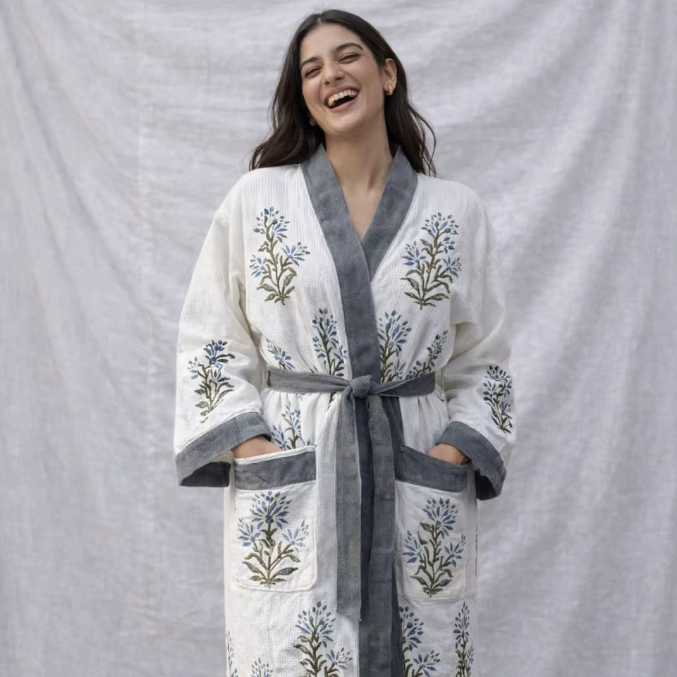 Albornoz largo de algodón tipo gofre, blanco, estampado a mano, para spa, hogar, hotel, playa, para mujer y hombre, venta al por mayor, personalizado para mujer