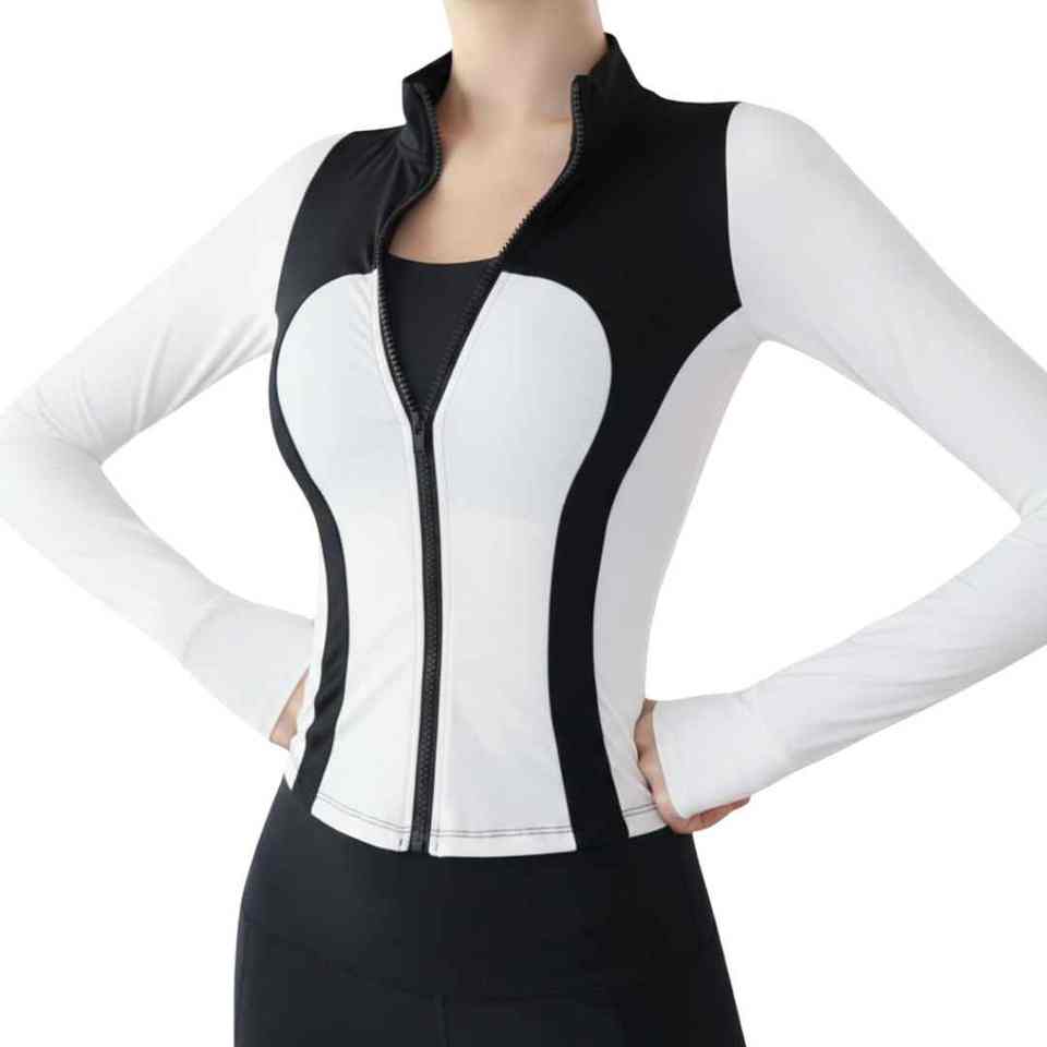 Chaqueta de Yoga Blanca con Contraste en la Parte Delantera y Trasera para Mujer, Manga Larga, Ropa Deportiva para Gimnasio, de Secado Rápido, con Cierre Completo, Ajuste Regular