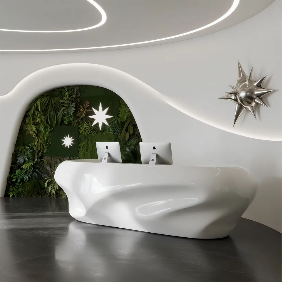 Mostrador de Recepción Curvo Blanco, Diseño Moderno y Minimalista con Iluminación LED para Vestíbulo de Oficina