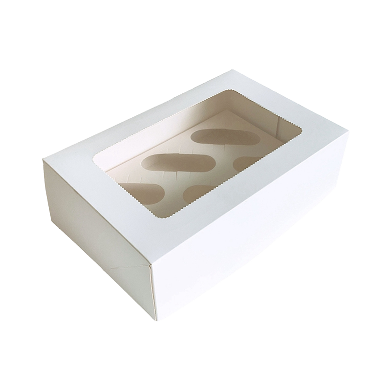 Cajas Blancas Desechables para Cupcakes con Ventana en Relieve, Laminación Mate, Recubrimiento UV, Impresión Personalizada con Lámina Dorada Brillante para Uso Alimentario
