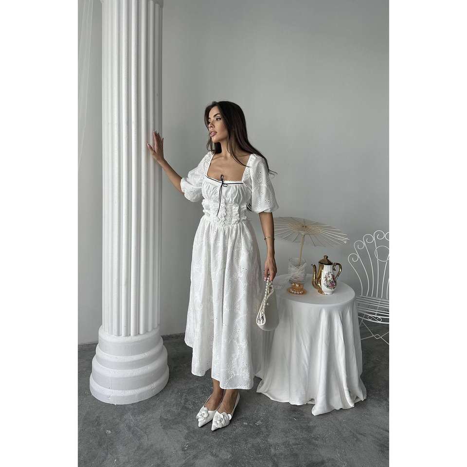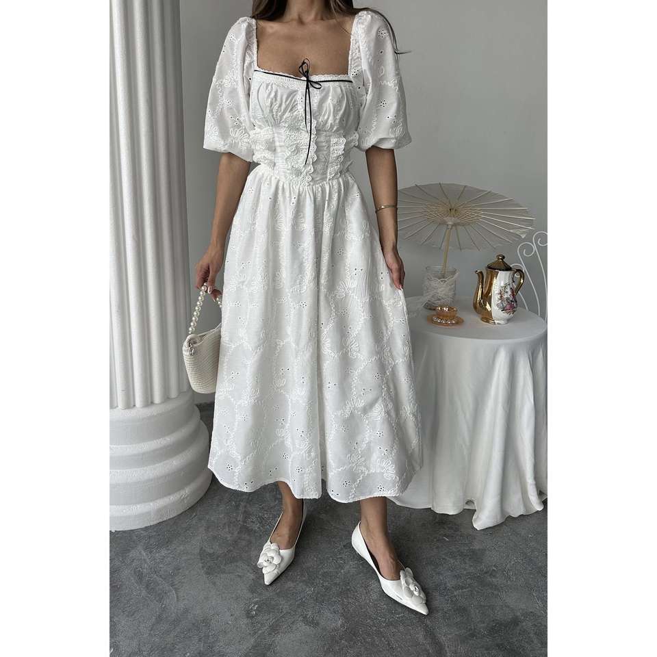Vestido Blanco Bordado con Corte en A, Cuello Cuadrado, Cintura Imperio, Estilo Vintage, Casual, Transpirable, Tejido, para Uso Diario