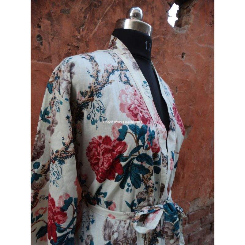 Blanco Floral bloque de mano estampado Maxi vestido Kimono elegante indio bohemio Hippie mujer camisón ropa de playa venta al por mayor verano primavera
