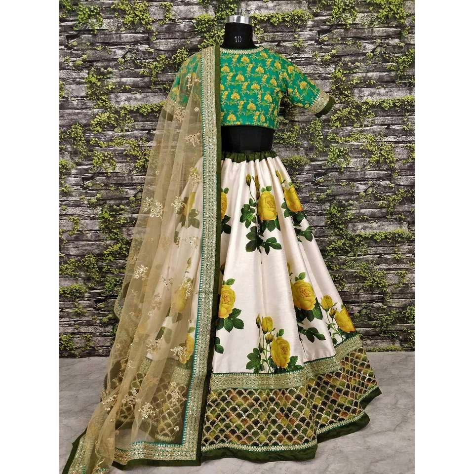Lehengas de diseñador con estampado floral blanco con blusa bordada