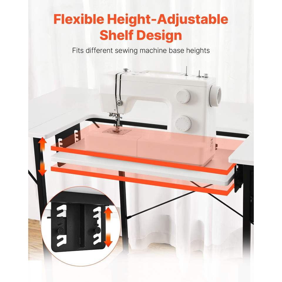 Mesa Plegable Blanca para Máquina de Coser con Estante Lateral, Patas de Acero Ajustables, Multiusos para Hogar, Estudio de Moda, Arte y Educación