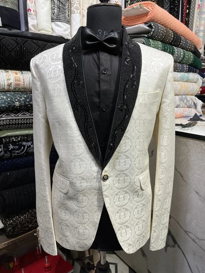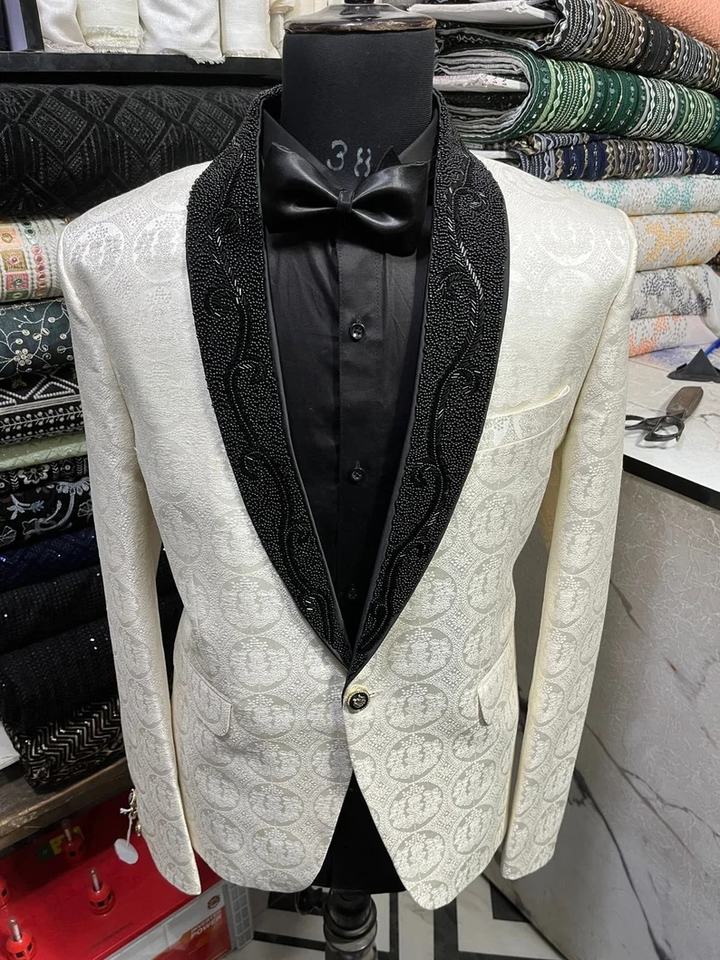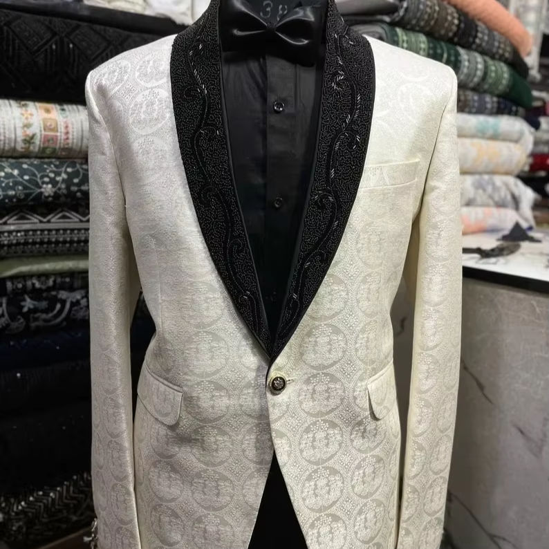 Traje de esmoquin blanco bordado a mano, traje de esmoquin de trabajo dorado Zari, traje de esmoquin de diseñador bordado a mano