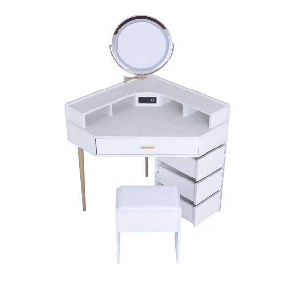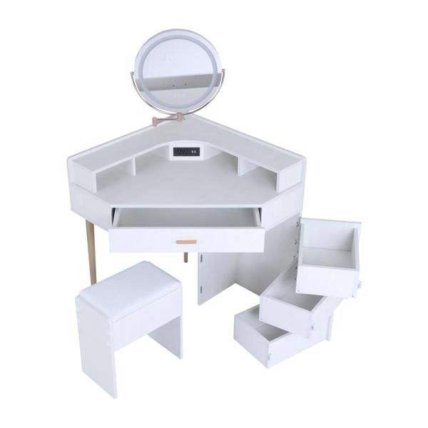 Juego de tocador de maquillaje blanco con taburete, espejo iluminado tricolor extraíble, cuatro cajones con enchufes