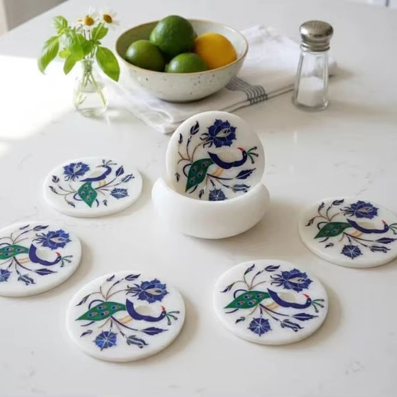 Posavasos de Mármol Blanco con Incrustaciones de Pavo Real, Posavasos de Piedra Floral Azul Hechos a Mano
