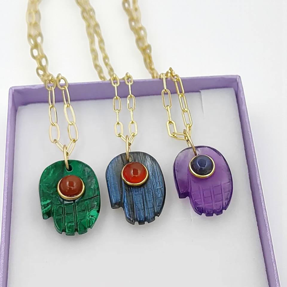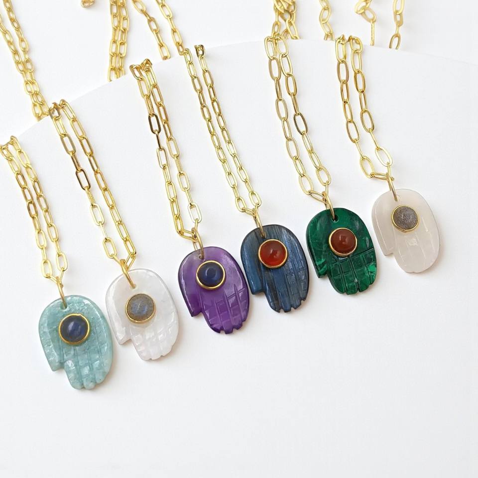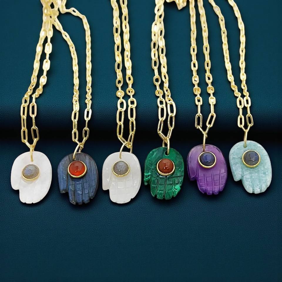 Nombre o palabras:Gemstone Hamsa mano colgante collar chapado en oro mal protección indio al por mayor joyería a granel proveedor mano forma collares