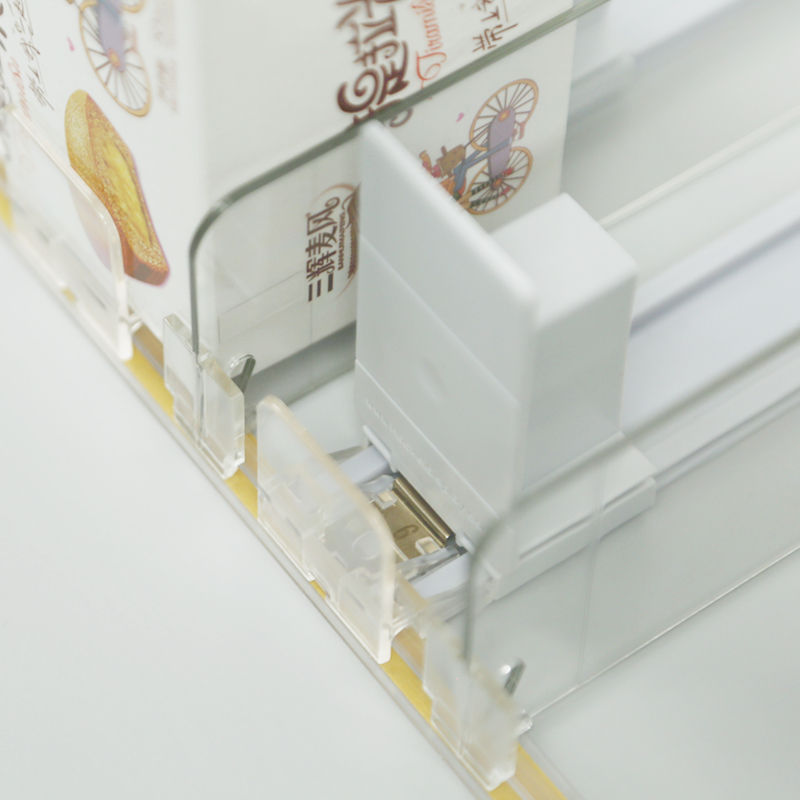 Empujador de estante automático de plástico blanco, sistema de bandeja, empujador de producto para exhibición