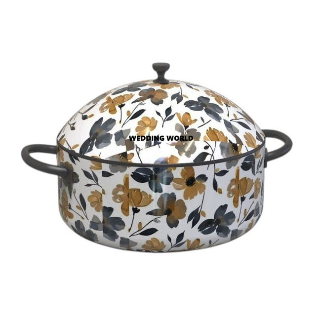 Polvo blanco recubierto con diseño de flores Cazuelas de metal de forma redonda Calentador de alimentos de metal al por mayor de lujo hecho a mano de alta calidad