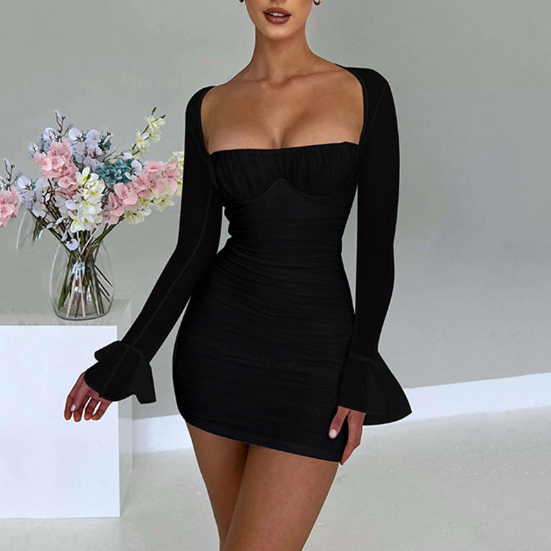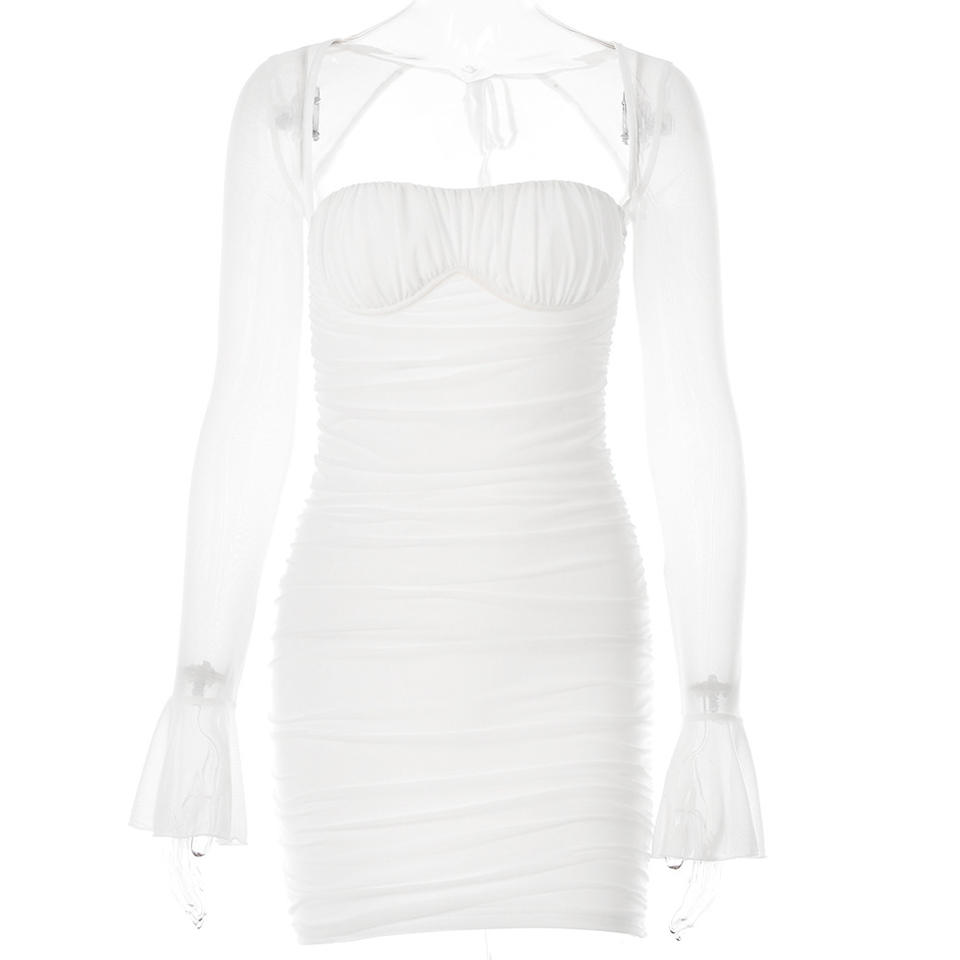 Vestido Blanco Ajustado sin Tirantes con Fruncido, Cintura Alta, Manga Larga, Transparente, Estilo Campana, para Cóctel, Color Sólido, Poliéster FD9732