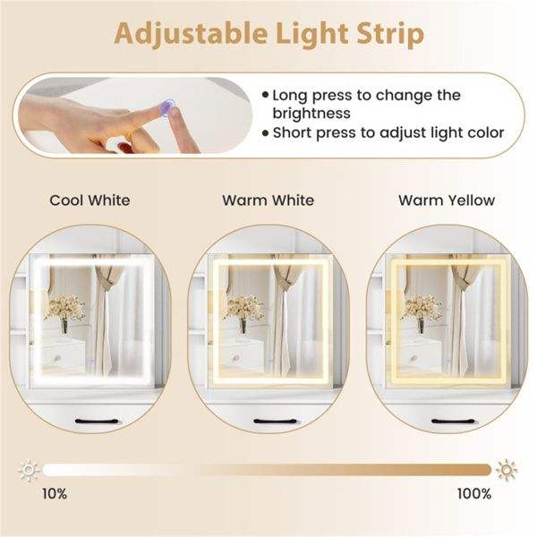 Juego de Taburete y Tocador Blanco con Tira de Luz LED de 3 Modos, Mesa de Maquillaje Antideslizante con Amplio Almacenamiento para Tocadores