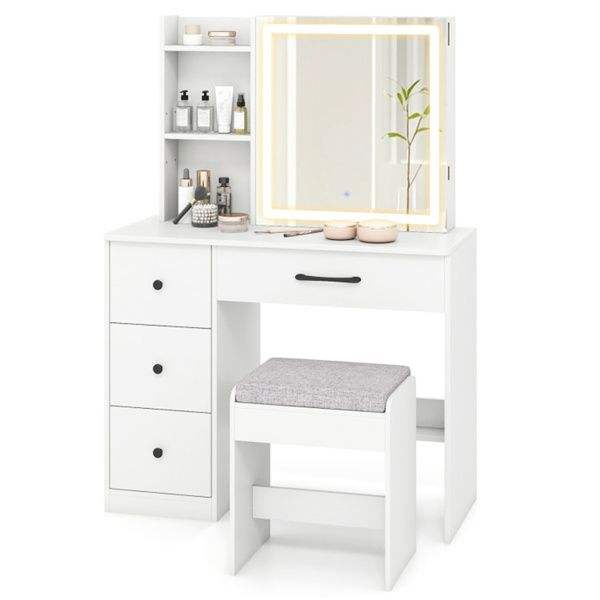 Juego de Taburete y Tocador Blanco con Tira de Luz LED de 3 Modos, Mesa de Maquillaje Antideslizante con Amplio Almacenamiento para Tocadores