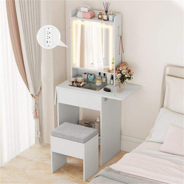 Tocador Blanco con Espejo LED, 2 Extensiones Abatibles y Estación de Carga Integrada para Maquillaje