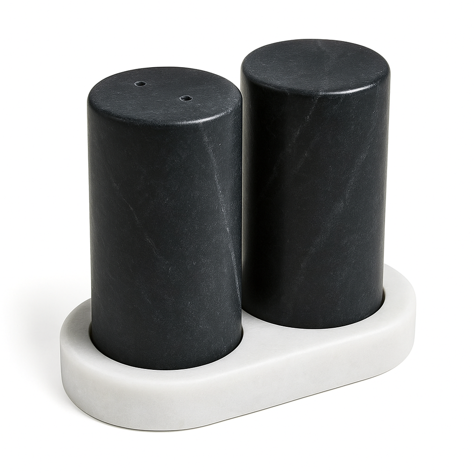 Juego de salero y pimentero de mármol blanco con elegante soporte ovalado negro, diseño cilíndrico minimalista moderno, accesorio de lujo para comedor.