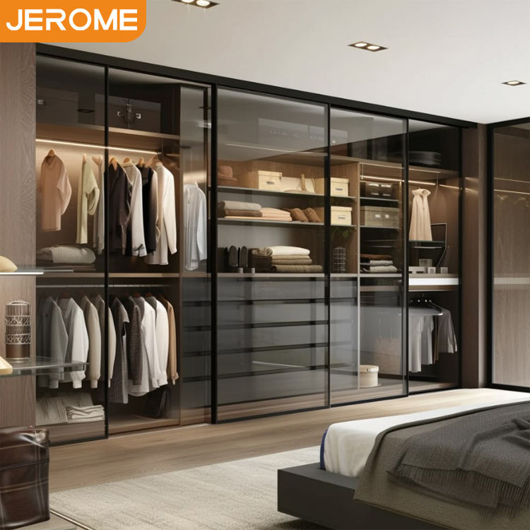 Diseño de personalización integral para toda la vivienda: mobiliario de dormitorio moderno y de lujo con vestidor 'walk-in' y puertas correderas de vidrio templado