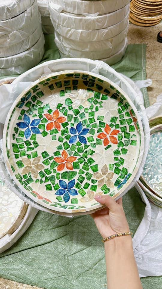 Venta al por mayor ACCESORIOS DE COCINA Bandejas redondas de ratán con asas de madera y parte inferior de Mother of Pearl