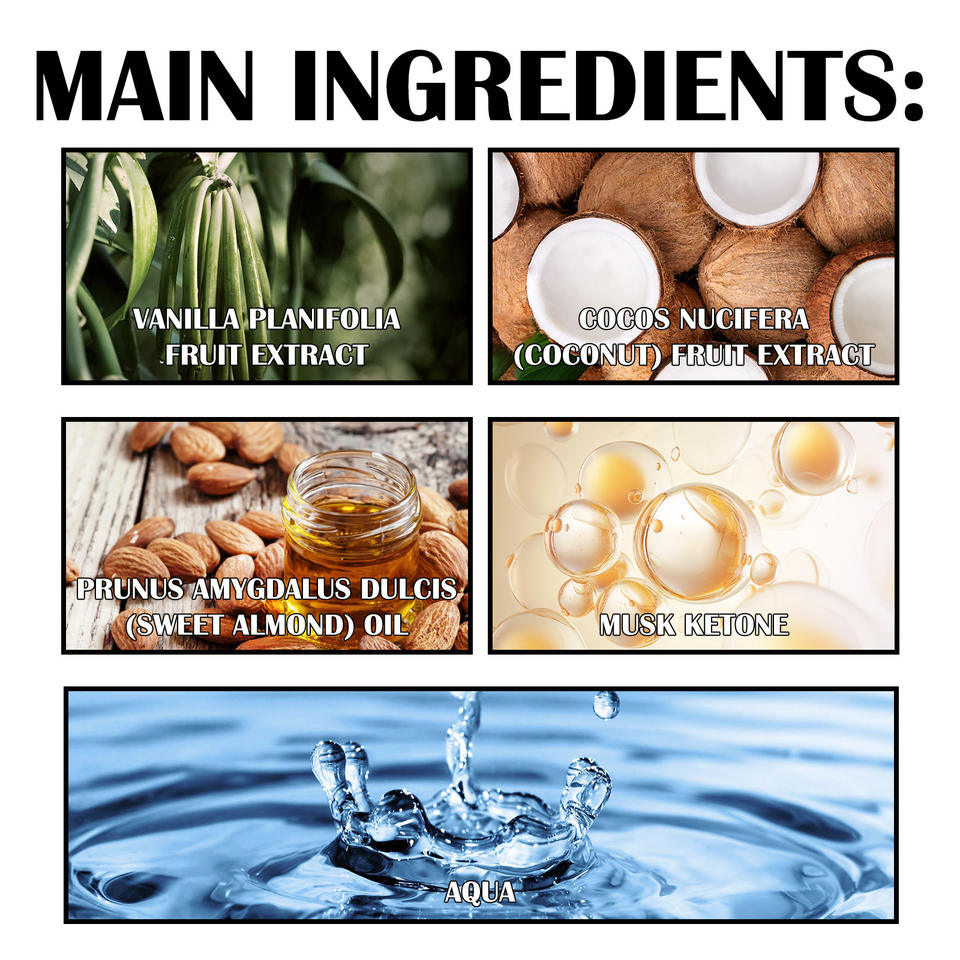 Material:Agua, extracto de fruta de vainilla de hoja plana, extracto de fruta de coco