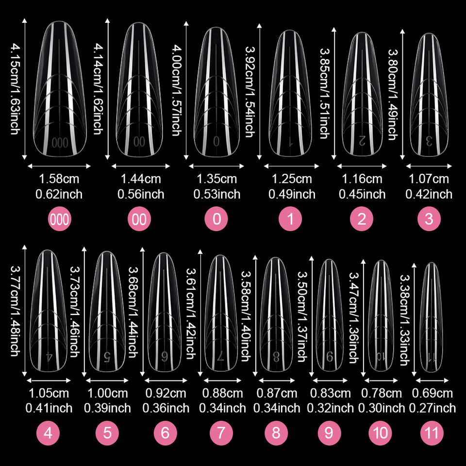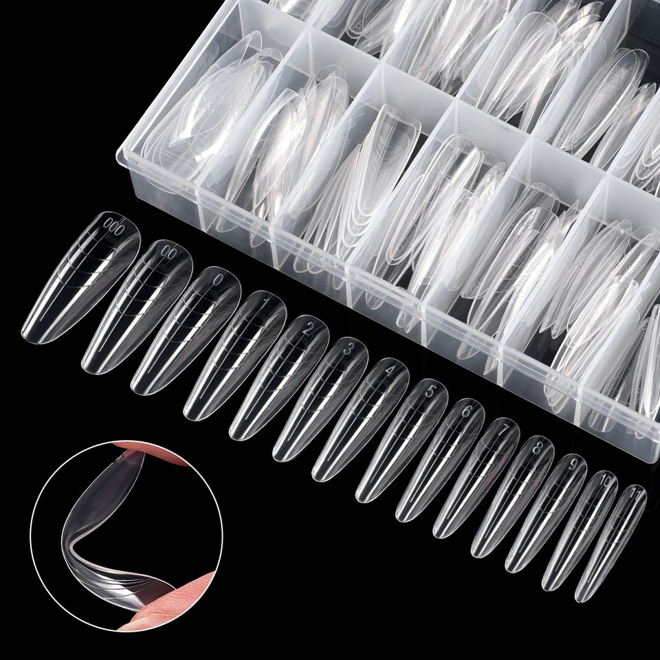 Venta al por mayor 140 piezas almendra formas duales 14 tamaño de construcción rápida modelo de uñas extensión sin rastro almendra transparente forma de uñas de plástico
