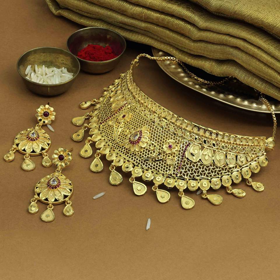 Venta al por mayor de collares de moda rellenos de oro de 14K 18K 24K, conjunto de joyería de gargantilla de oro de diseño floral, collares de gargantilla de Formación de Piedra rubí.