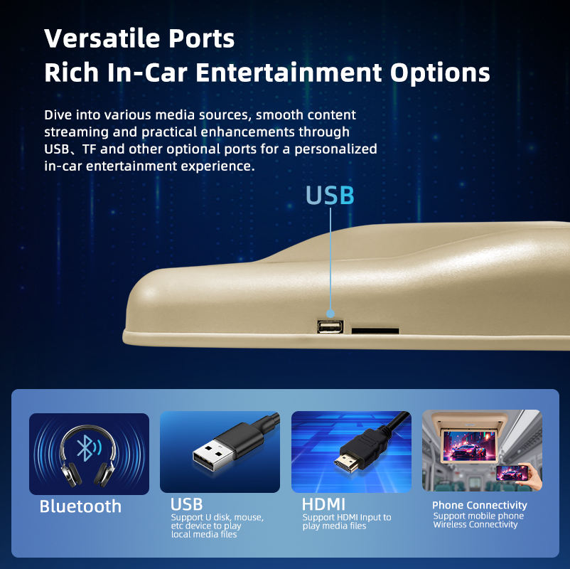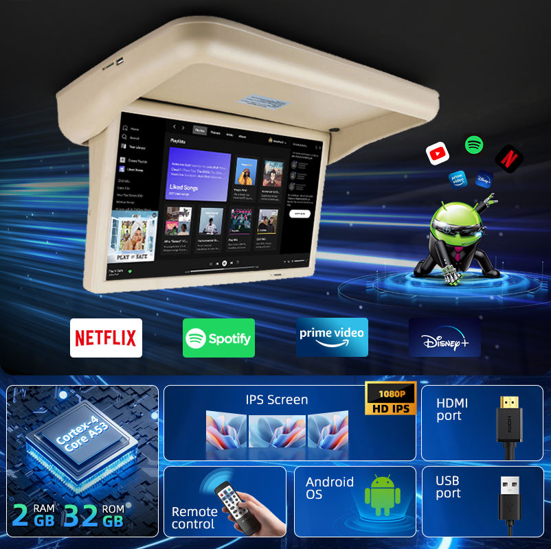 TV aérea motorizada de 19 pulgadas al por mayor, pantalla multimedia HD Android, monitor montado en el techo para entretenimiento de flota de autobuses y autocares