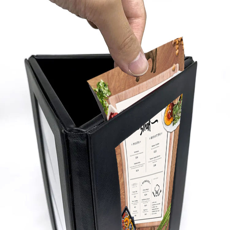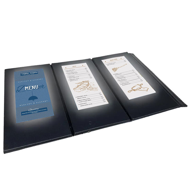 Soporte de mesa triangular giratorio de 3 vistas para menú iluminado, de cuero, para restaurante, bar, discoteca, cubierta de menú iluminada, venta al por mayor