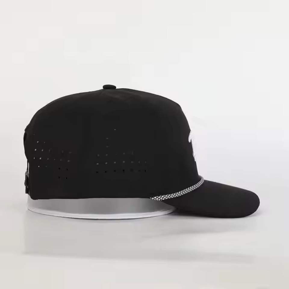 Venta al por mayor de 5 paneles de poliéster corte láser cuerda sombrero personalizado 3D bordado Logo impermeable ligero rendimiento gorras Vietnam fábrica